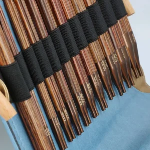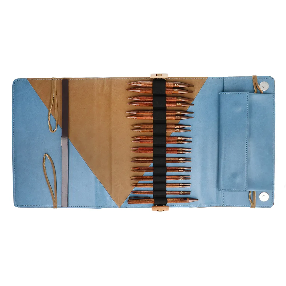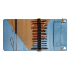 De set wordt geleverd in een stijlvol opbergetui van hoogwaardig kunstleer. Dit etui is niet alleen praktisch voor het opbergen van al je brei-accessoires, maar kan ook worden gebruikt als patroonhouder.