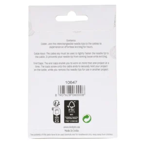 De kabel bestaat uit een sterke stalen kern met een gladde nylon coating, waardoor hij stevig is én moeiteloos door de steken glijdt. Aan beide uiteinden bevindt zich een handig gaatje voor het kabelsleuteltje, waarmee je de naaldpunten stevig vastzet. Deze opening is ook ideaal voor het aanbrengen van een lifeline (hulpdraad), zodat je je breiwerk veilig kunt uithalen of gevallen steken eenvoudig kunt herstellen.