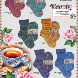 Opal Beauty 5 Tea Time 4-draads garen is een slijtvast en huidvriendelijk garen, vervaardigd uit 75% scheerwol (superwash) en 25% polyamide. De zes betoverende zelfstrepende kleurcombinaties in deze collectie zijn geïnspireerd op het warme, knusse gevoel van een dagelijks theemoment.