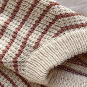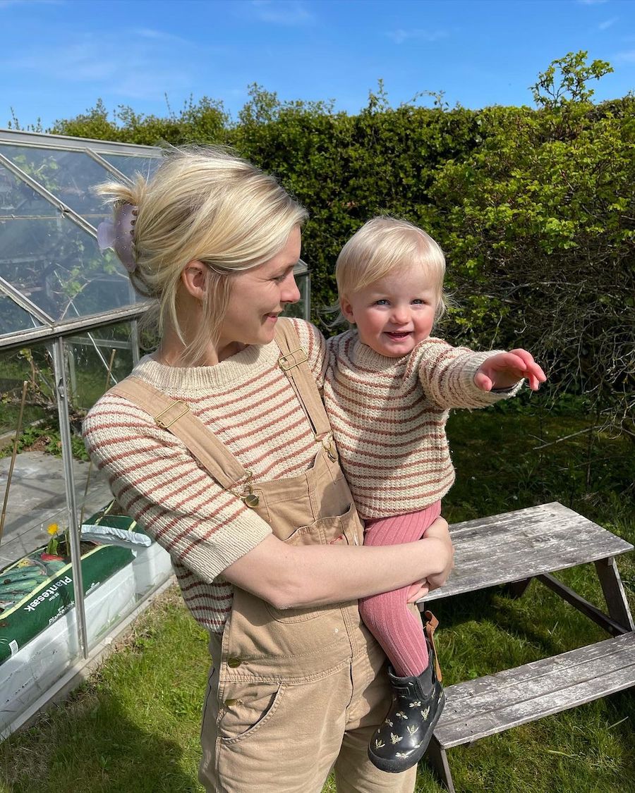 De witte en rode Friday Tee is gebreid in Sunday van Sandnes Garn in de kleuren Almond [2511] en Dusty rouge [3553].