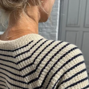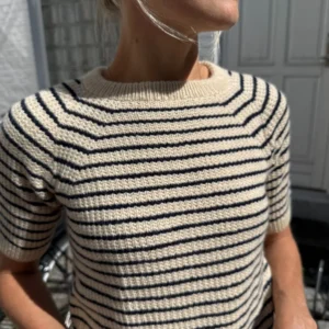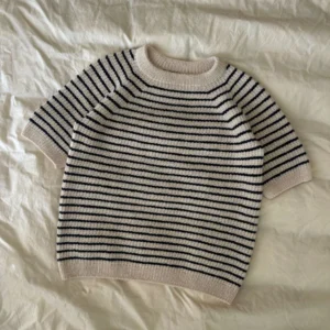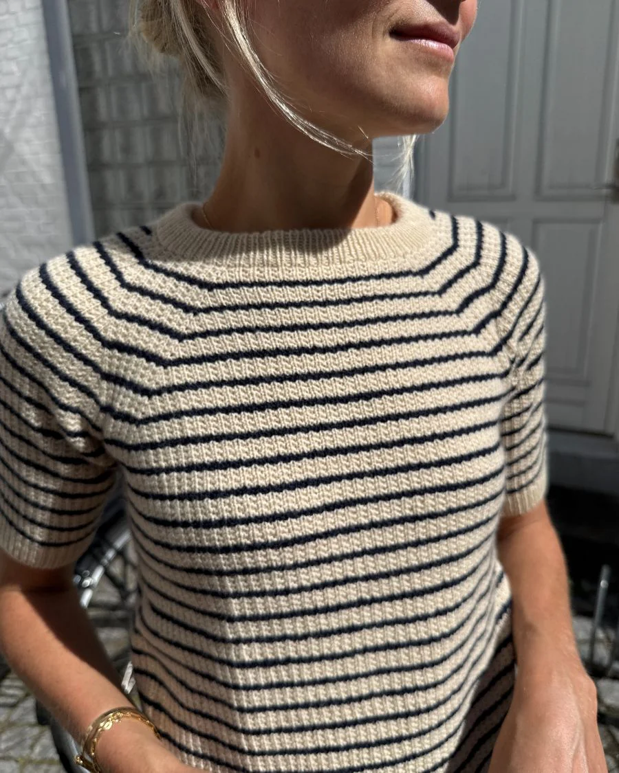 De witte en blauwe Friday Tee is gebreid in Sunday van Sandnes Garn in de kleuren Almond [2511] en Night sky [5591].