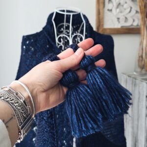 De sjaal wordt afgewerkt met handgemaakte kwastjes, die een speels en bewegend accent toevoegen. Perfect als warme laag in de winter, een lichte omslag in de lente, of als stijlvol accessoire het hele jaar door.