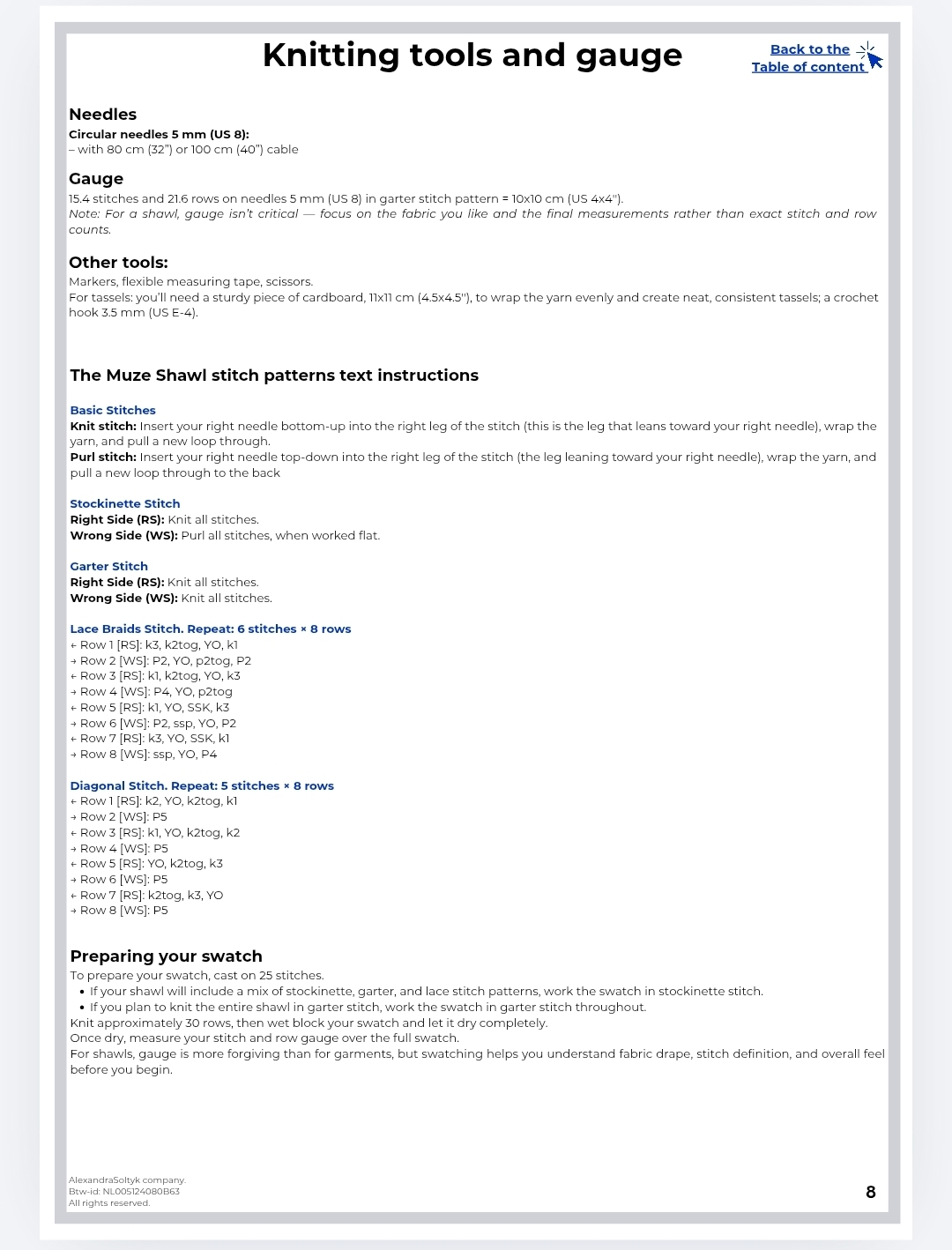 Je kunt de Muze Shawl volledig in ribbelsteek breien voor een stevige, minimalistische look, of kiezen voor kantpatronen voor een lichtere en meer vloeiende stof. Beide opties zijn inbegrepen, zodat je zelf kunt bepalen hoe eenvoudig of gedetailleerd jouw sjaal wordt.